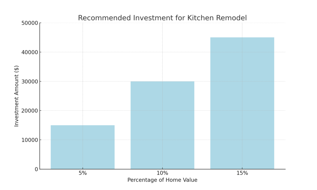Planning a kitchen remodel? According to industry standards, investing 5% to 15% of your home’s value is considered optimal for maintaining or increasing its resale value. For instance, if your home is valued at $300,000, allocating up to $45,000 for your kitchen remodel can yield a solid return on investment. Our experts will guide you through each step, ensuring transparent budgeting and quality results.